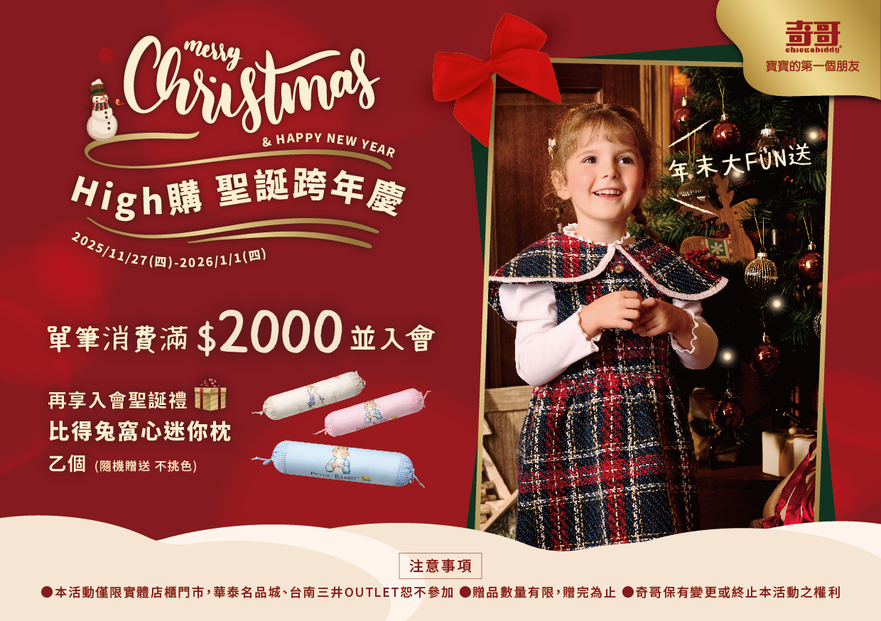 凡於奇哥實體店櫃門市消費$2,000以上,並加入奇哥會員,再加碼贈入會聖誕禮 比得兔窩心迷你枕 乙個。