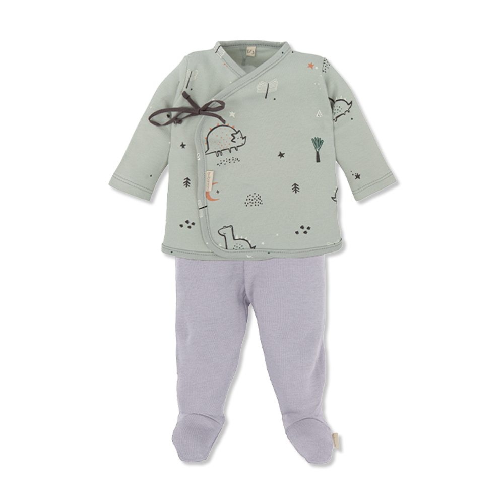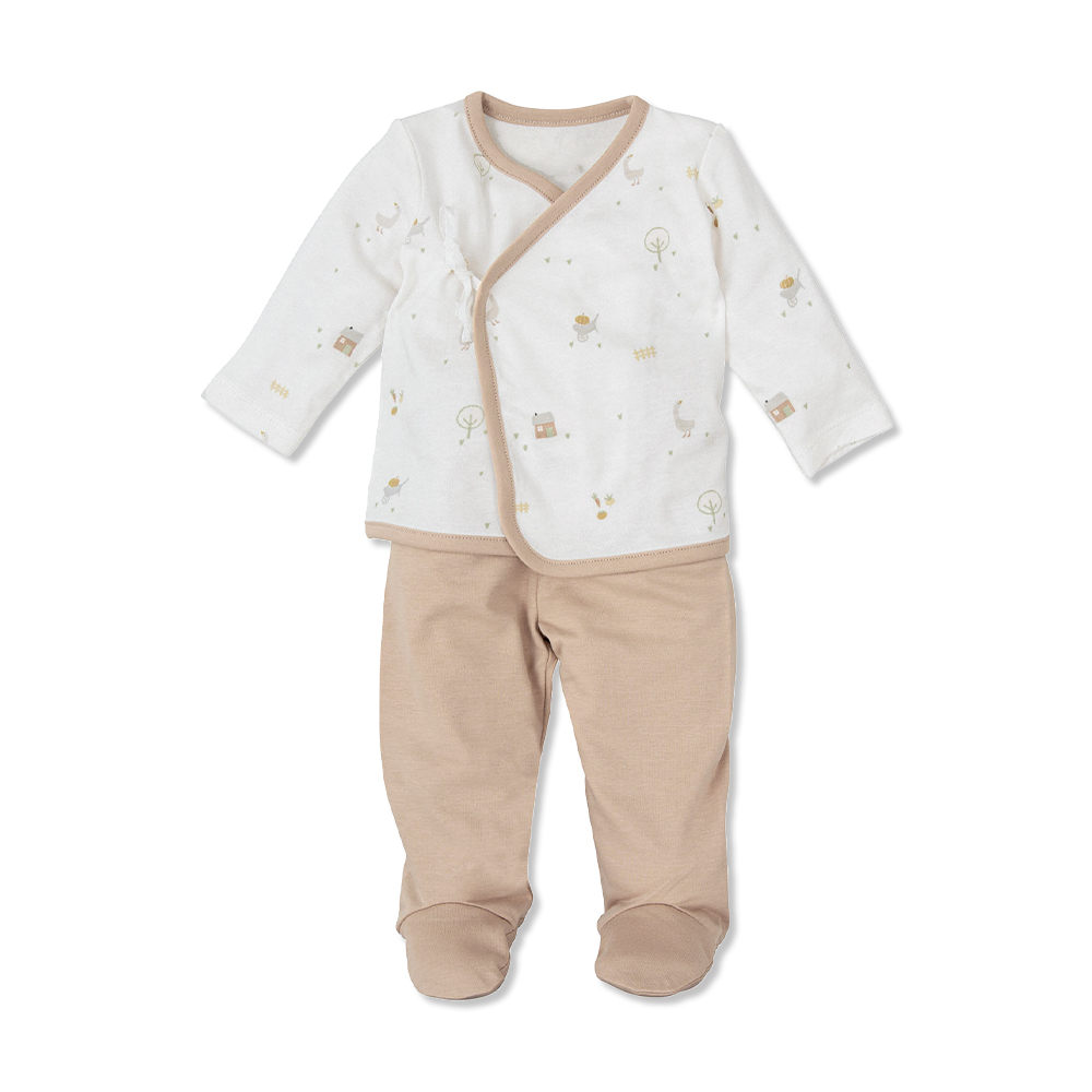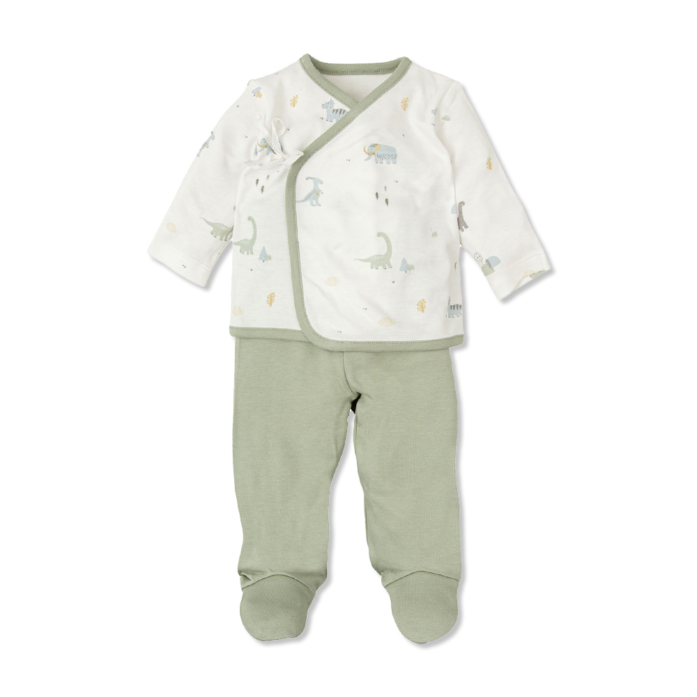 內含一件柔軟親膚的上衣,還有一件與上衣顏色相呼應的包腳長褲,適合1~3個月的寶寶著用。