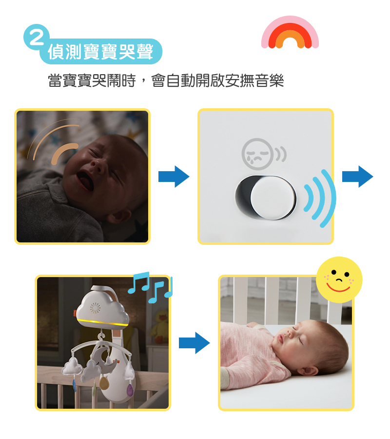 2.可偵測寶貝哭鬧聲,自動開啟安撫音樂。