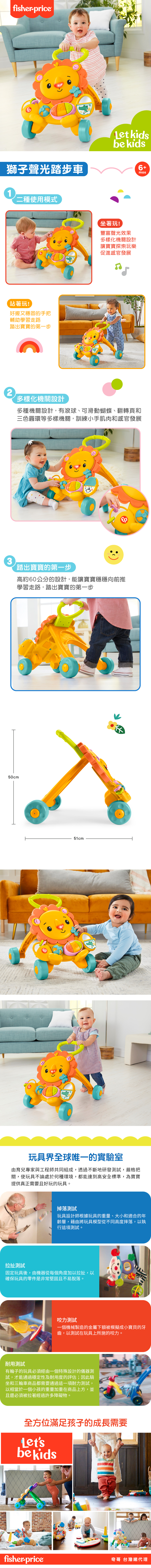 A:費雪獅子聲光嬰兒學步車有坐著、站著、推行三種玩樂模式!豐富機關設計全面培養寶寶語言、感官和行走。