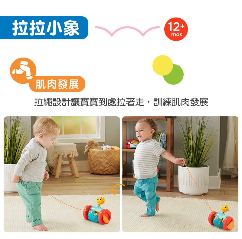 拉繩設計讓寶寶可以拉著到處走,訓練寶寶的大肌肉發展。移動時,小象耳朵會拍動、頭頂的小鳥也會前後搖晃。