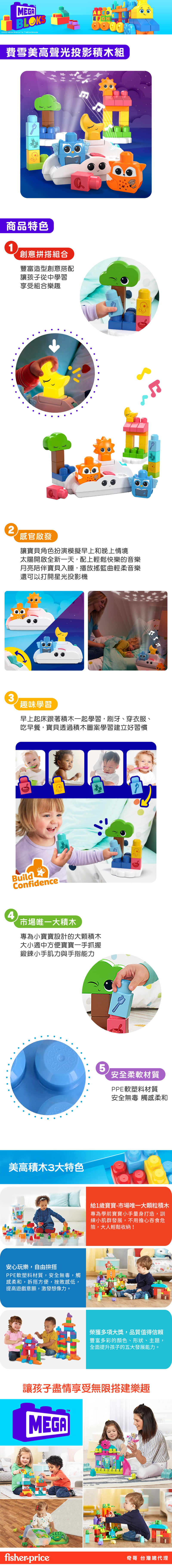 1. 費雪美高聲光投影積木組除了美高積木外, 還有有太陽、月亮和4種角色可以讓小朋友們建立早上及夜晚不同的情境。