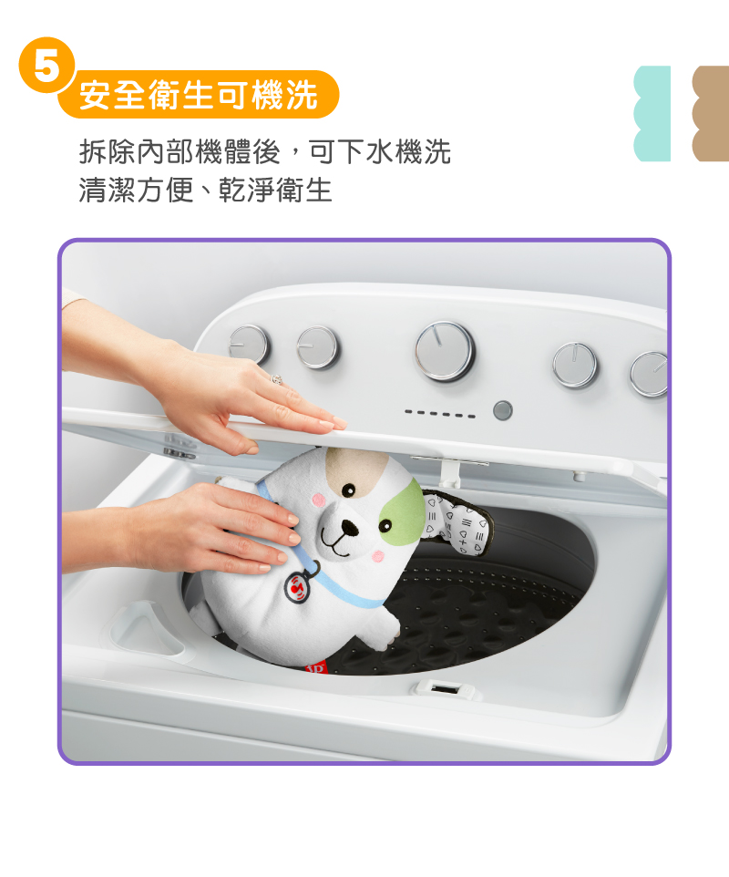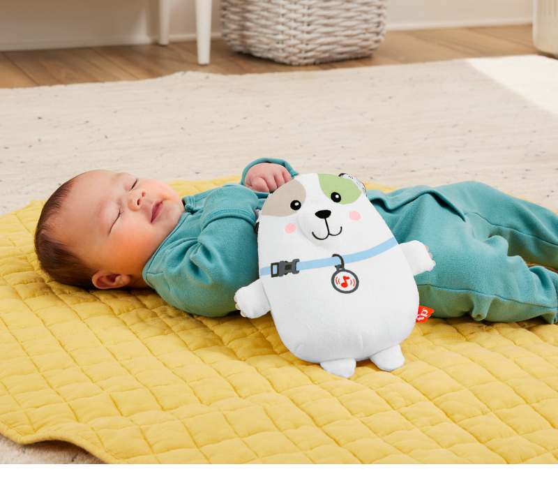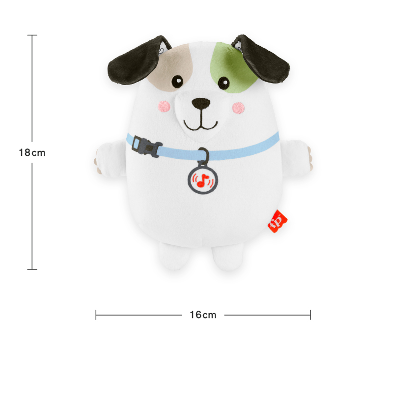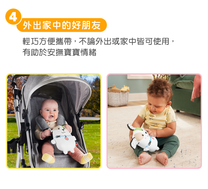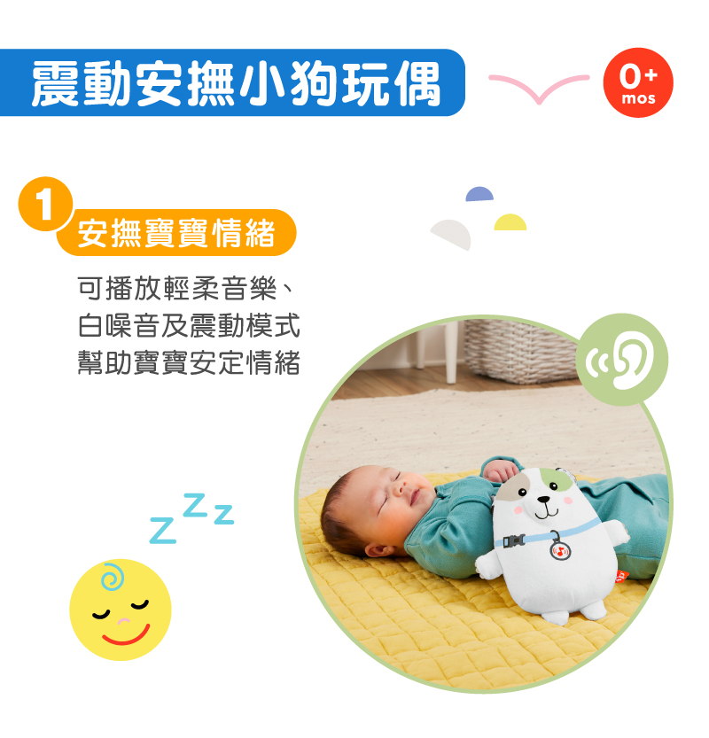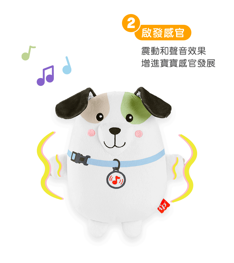 1. “費雪震動安撫小狗玩偶”有輕柔音樂、白噪音及震動模式。