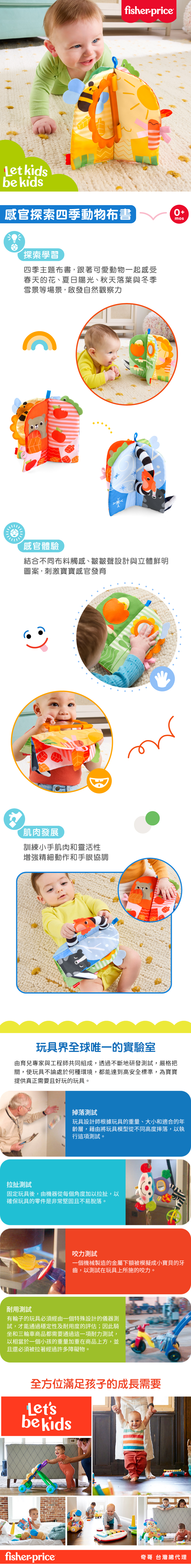 1. ""費雪感官探索四季動物布書""專為新生兒與幼兒設計,每一頁都充滿色彩、角色與豐富的感官細節,讓寶寶在翻閱中開心學習、快樂成長。