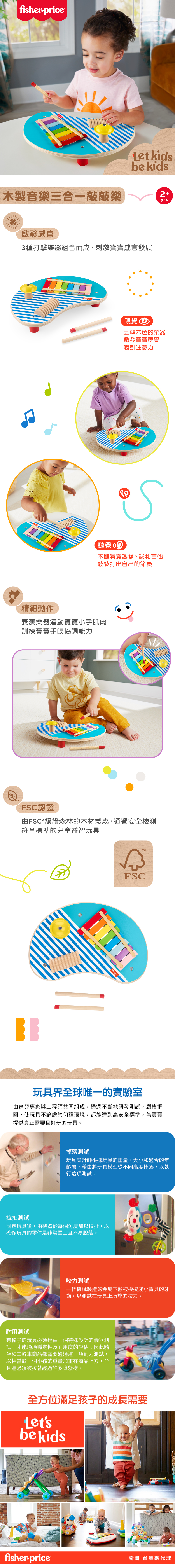1. ""費雪木製音樂三合一敲敲樂""是將 3 種打擊樂器組合而成的音樂玩具。