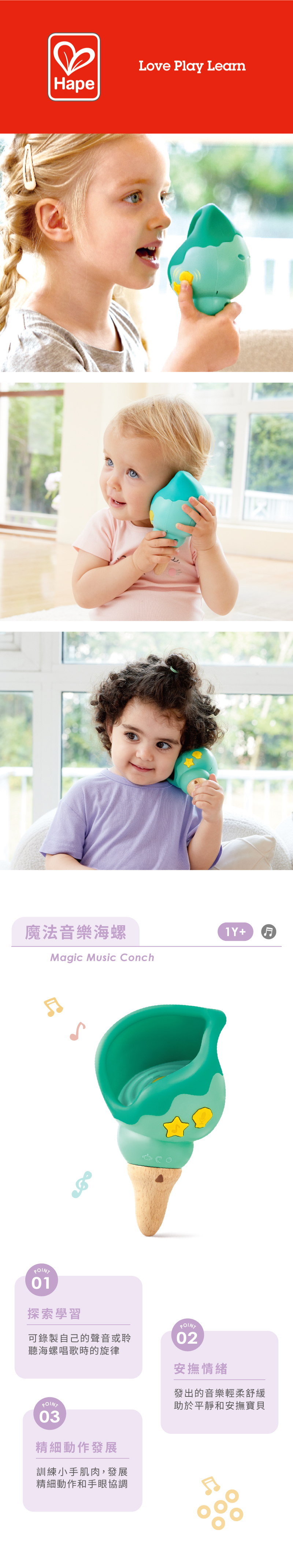 使用我們的魔法音樂海螺玩具體驗迷人的大海之聲。錄製自己的聲音或聆聽海螺唱歌時的旋律。