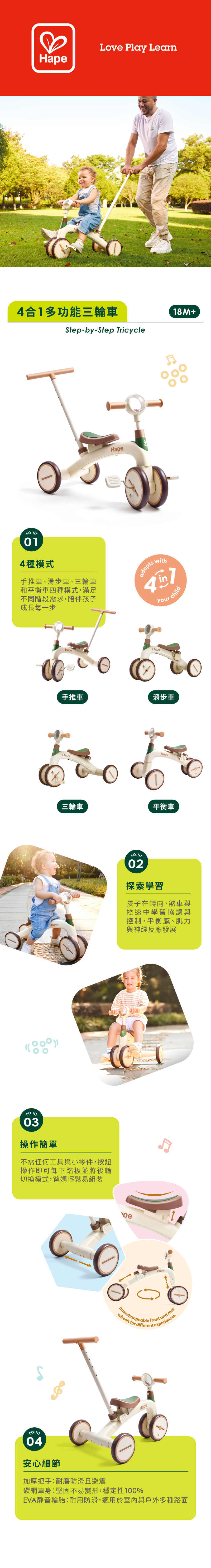 4種模式:適合1.5-5歲兒童的4合1兒童三輪車,讓孩子們滑行或騎來騎去,是踏上踏板自行車之路上理想的一歲生日禮物,幫助他們在學習如何轉向和調整速度的同時發展力量、平衡和神經。