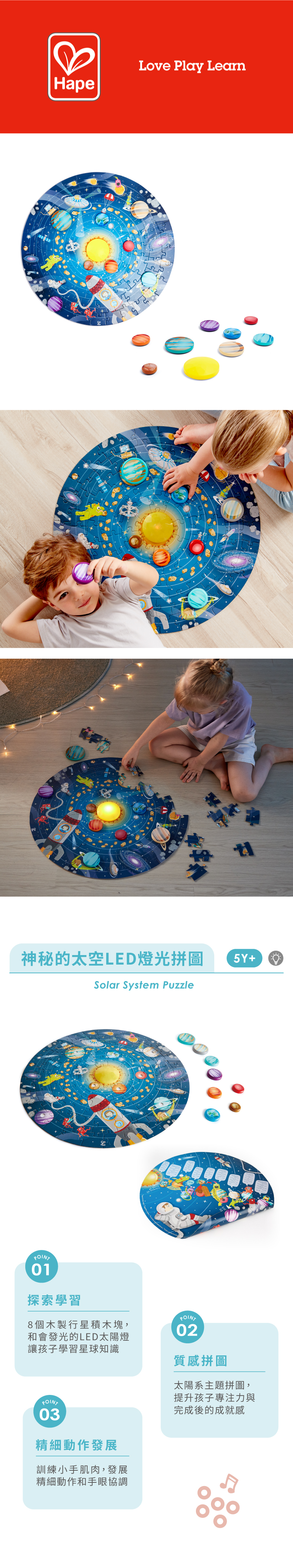 太陽為環繞的行星提供光和熱。想要瞭解更多地球之外的太空嗎?不如從這款太陽系拼圖開始吧:木製行星積木塊、發光LED太陽燈,還有海報教給我們星球知識。