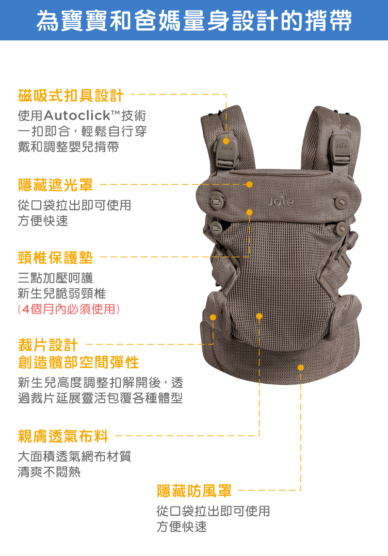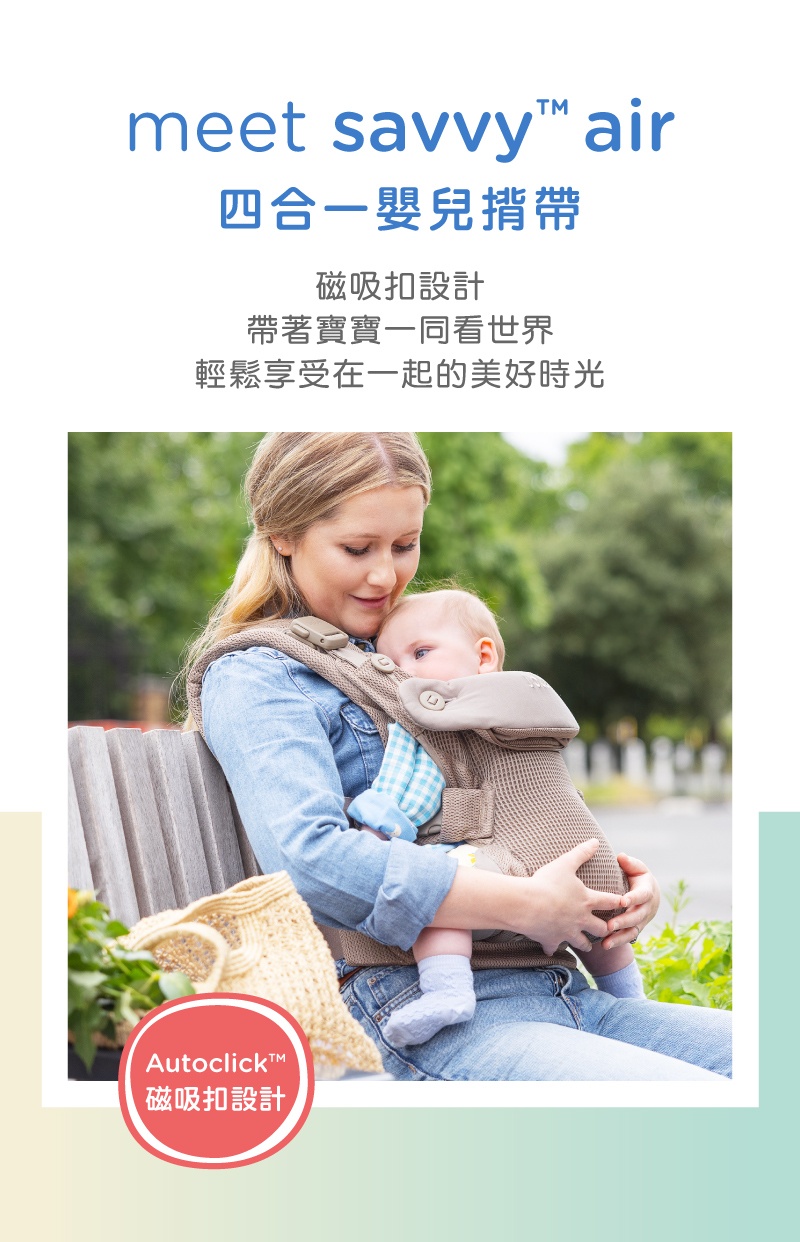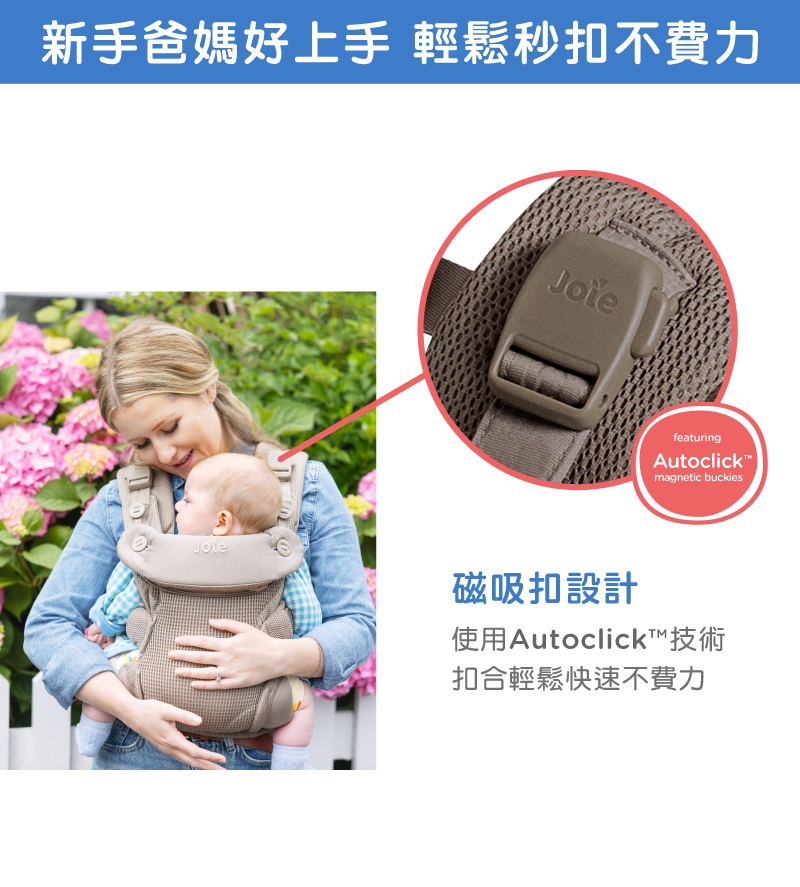 磁吸式扣具使用獨家autoclick™技術,輕鬆將寶寶放入及取出