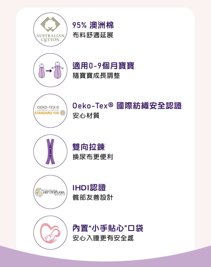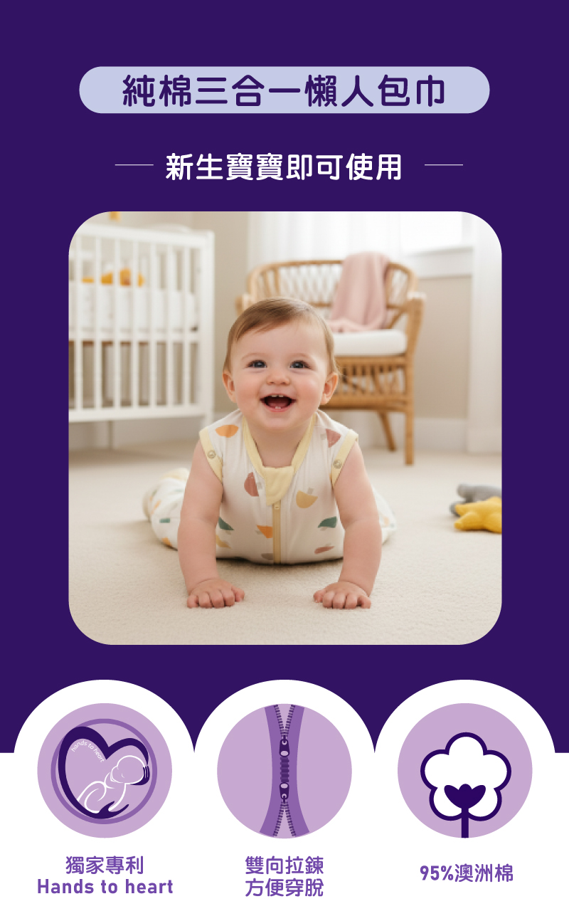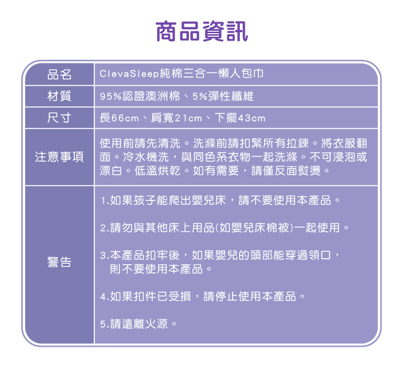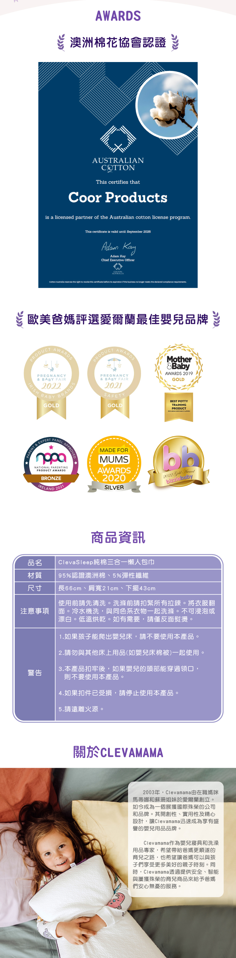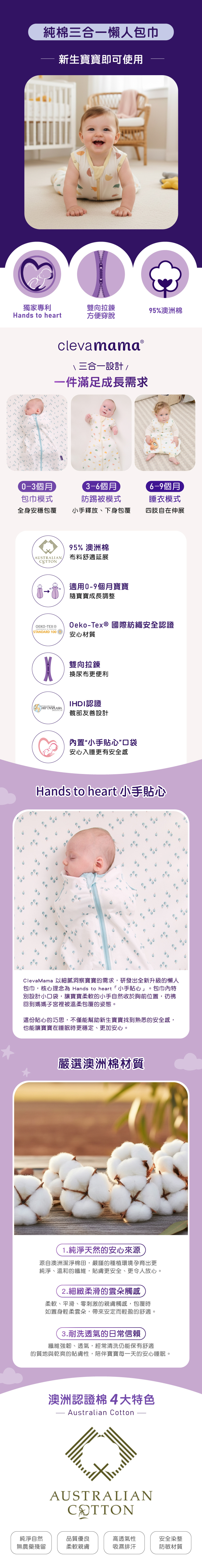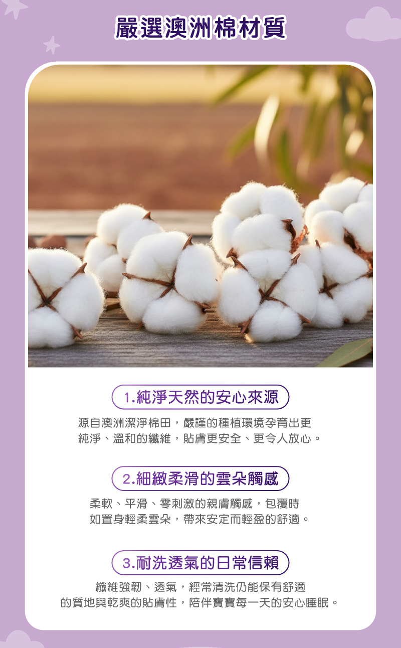 1.本產品陪伴您的孩子度過新生兒的包巾時期。由100%澳洲認證棉製成。