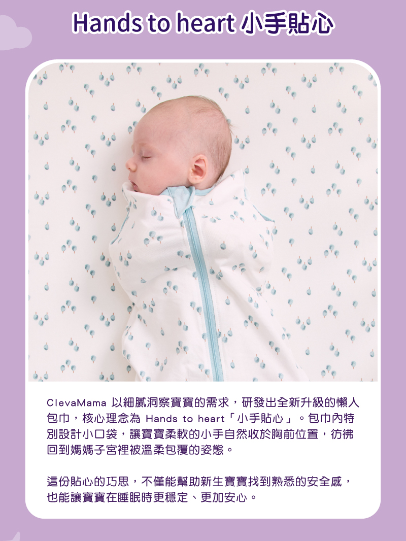 3.獨家專利的hands to heart設計,讓寶寶的手自然交疊在胸前,像在媽媽的肚子裡一樣,安穩入睡。
