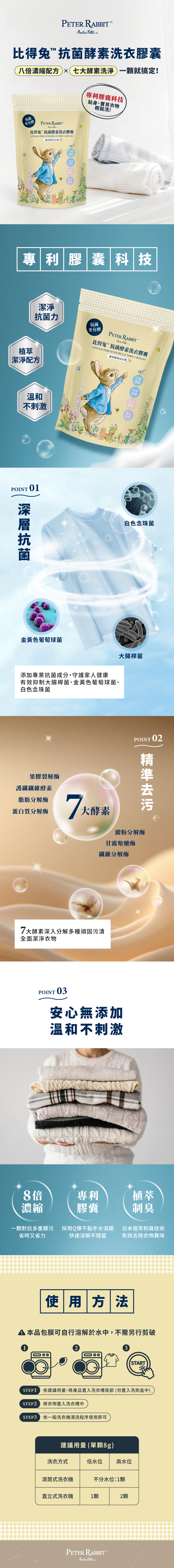 7大酵素精準去污:果膠裂解酶、護纖纖維酵素、脂肪分解酶、蛋白質分解酶、澱粉分解酶、甘露聚醣酶、纖維分解酶,深入分解多種頑固污漬,全面潔淨衣物。
