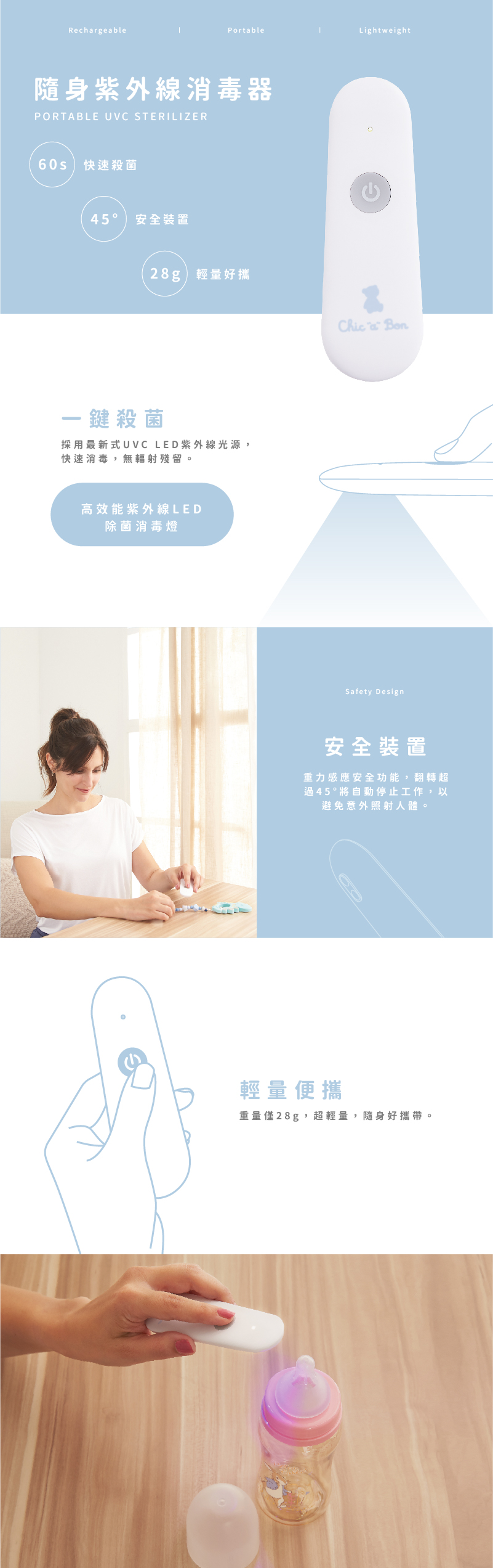 ● 安全裝置:設有重力感應安全功能,當產品翻轉超過45°時,紫外線將自動停止工作,以避免意外照射到人眼或皮膚