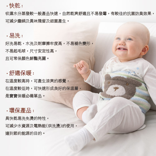 1.快 乾: 本產品吸濕擴散及水分蒸發速率,較一般產品快速,自然乾爽舒適且不易發霉,可減少塵螨及避免嬰兒溢奶嘔吐造成的異味殘留及細菌產生。