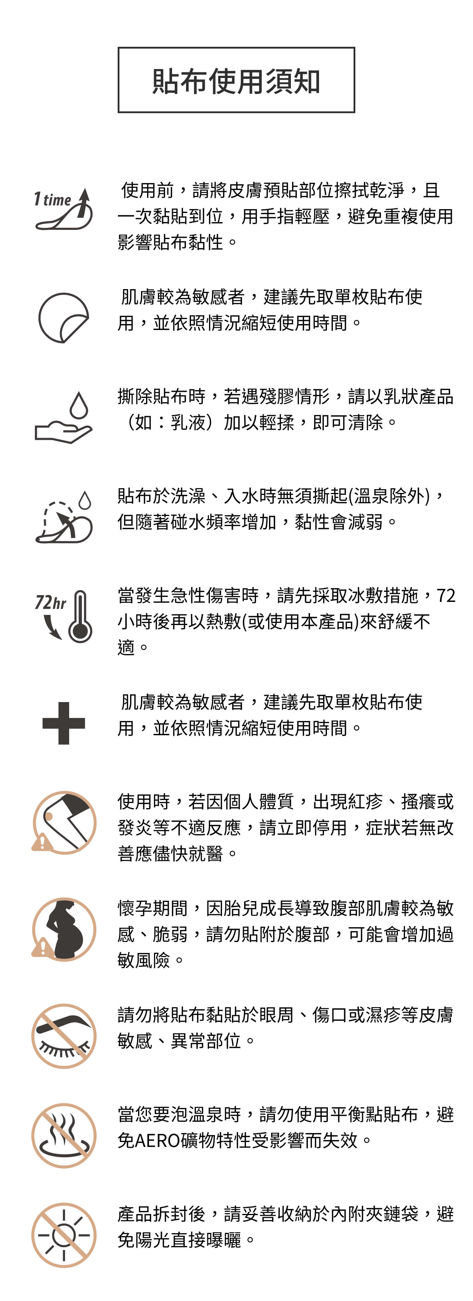 6. 當您要泡溫泉時,請勿使用本貼布,以避免貼布中的AERO礦物功能失效。