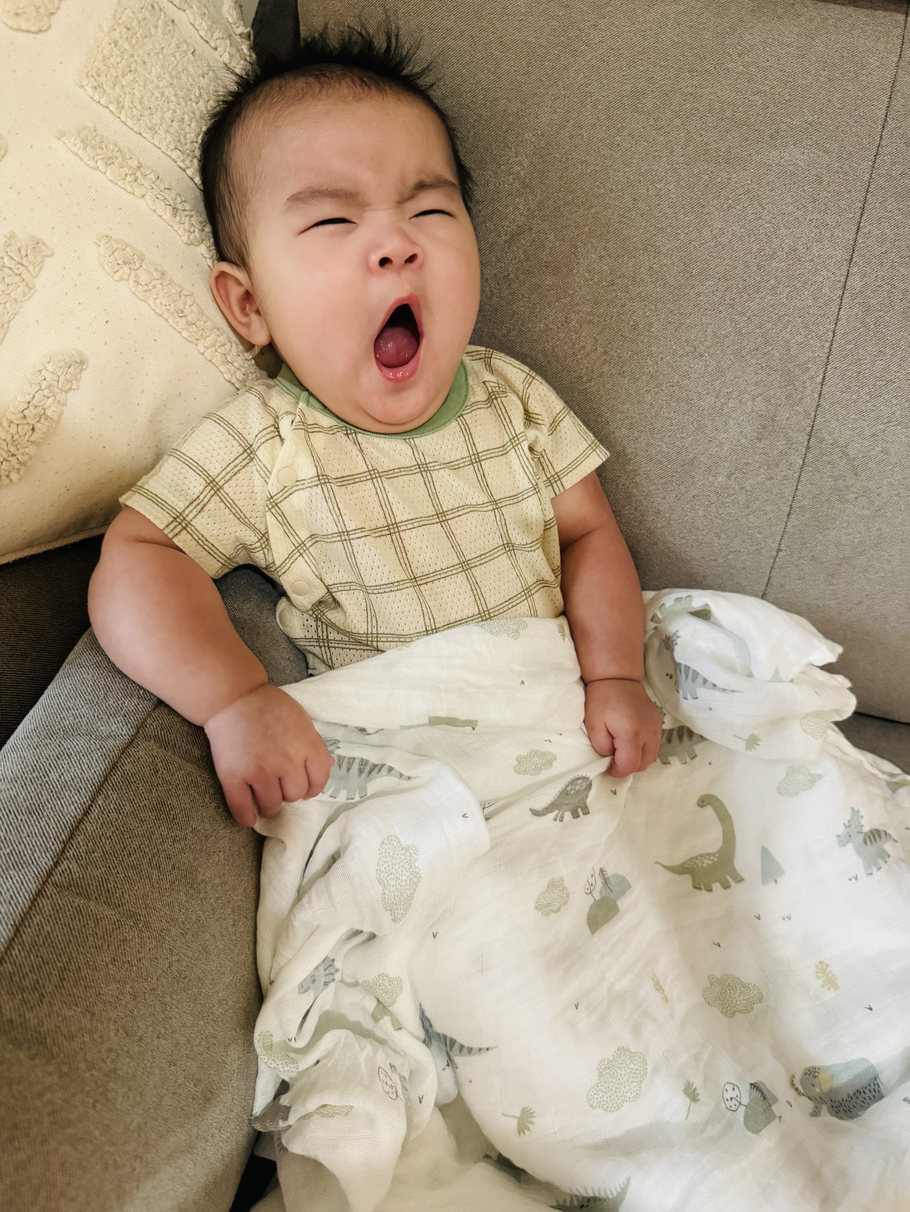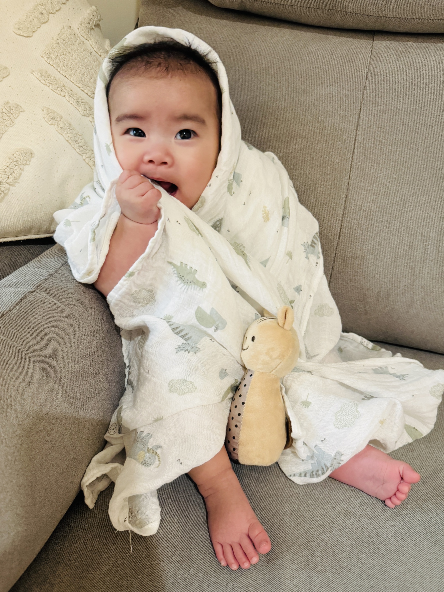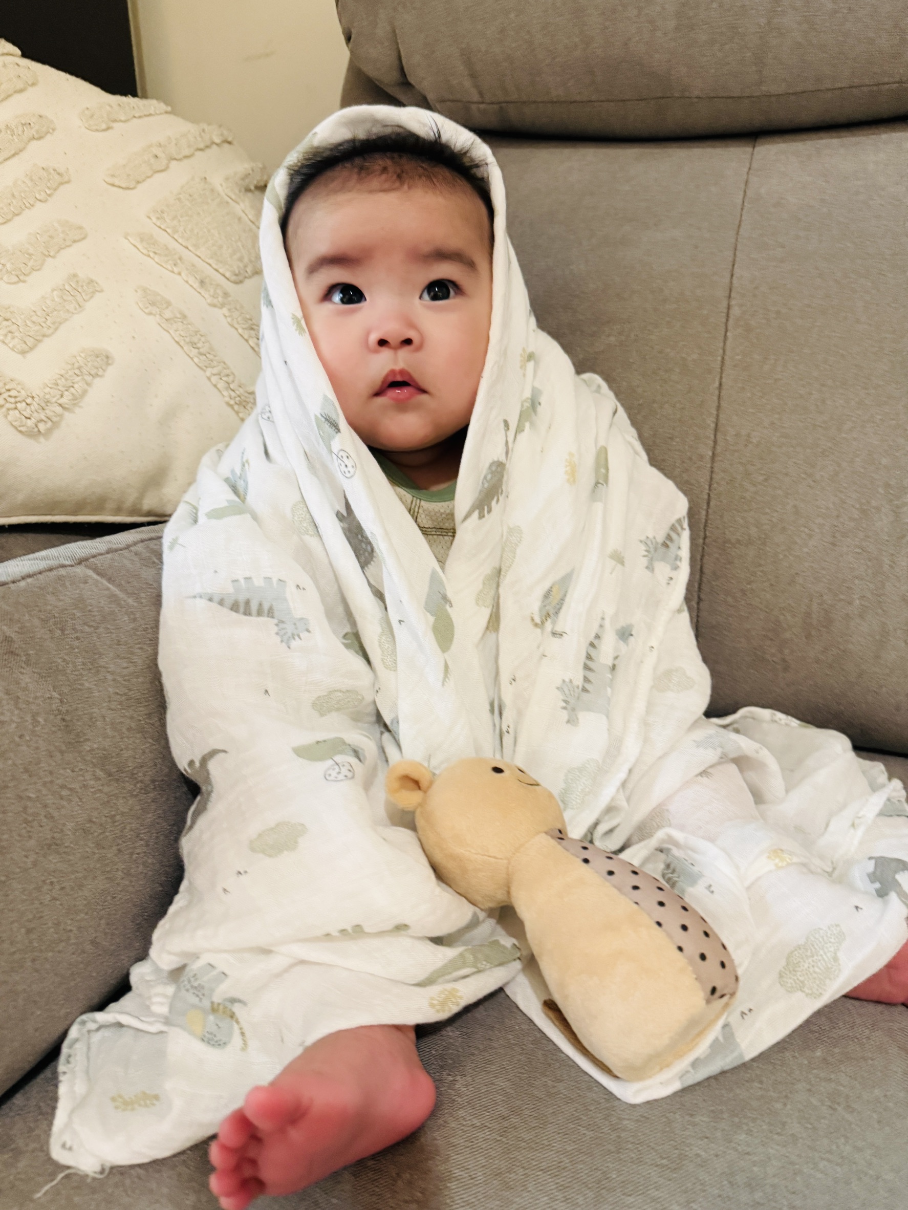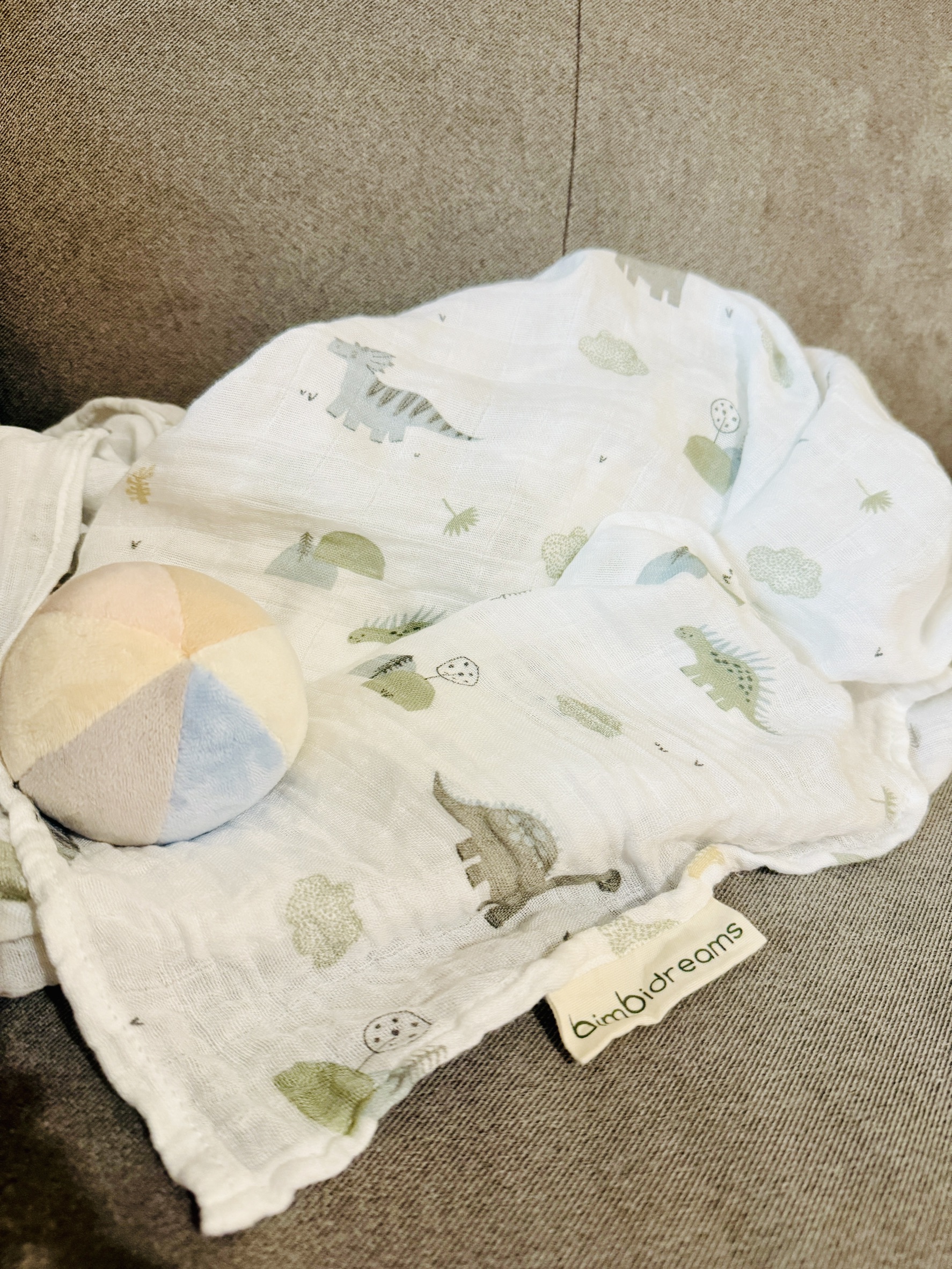 一收到bimbidreams的竹纖維紗布包巾就被可愛的恐龍圖案花色可愛到! 怎麼跟我家的龍寶寶那麽搭❤️