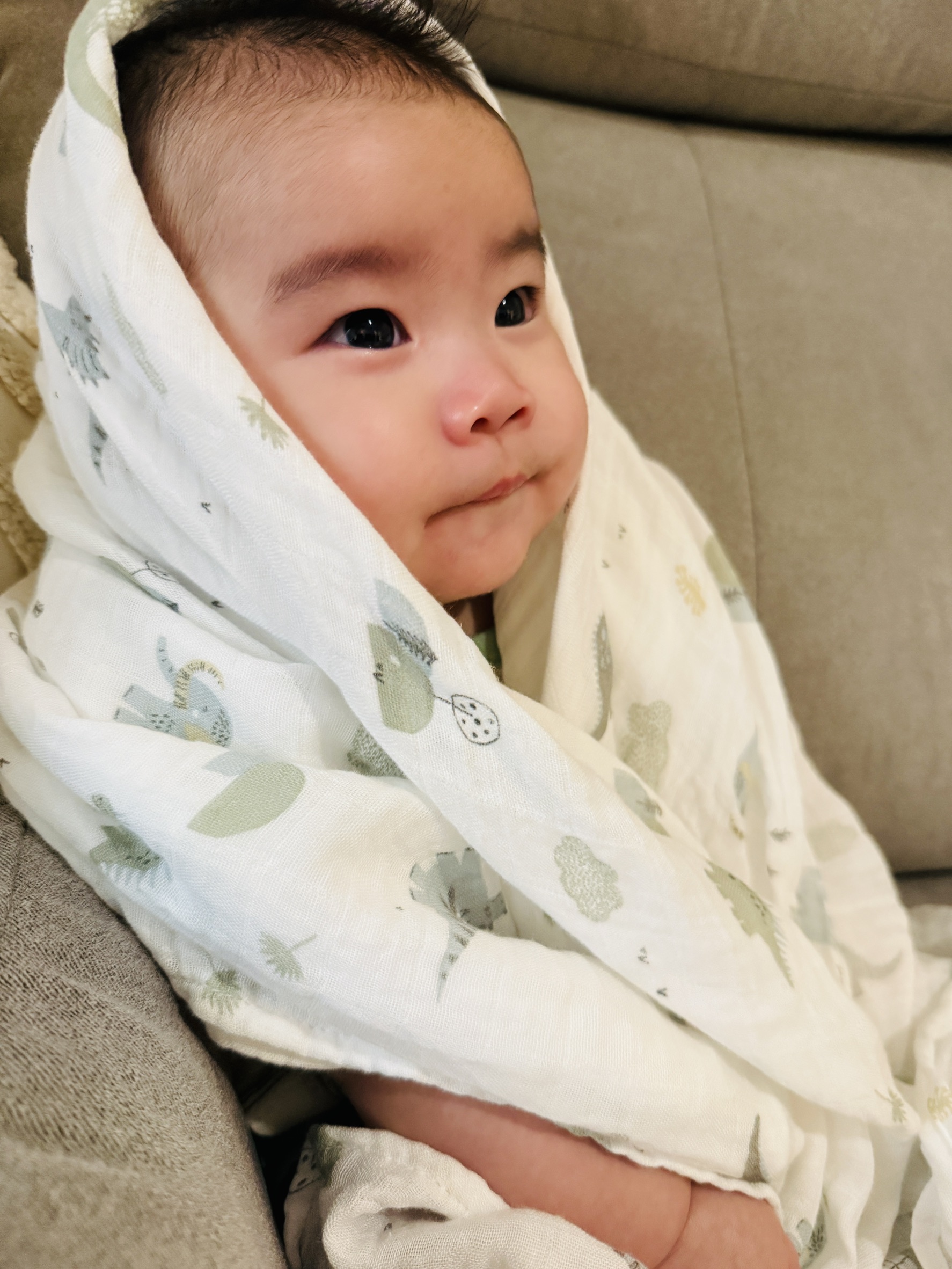 尺寸120x120夠大,蓋一層蓋兩層都沒問題~ 即使在戶外,用來遮陽也很適合,不會讓寶寶全身汗,非常涼爽! 洗澡的時候當作洗澡巾也很適合 材質柔軟又不刺激~ 或是洗完澡穿衣服前怕著涼也很適合直接把寶寶裹起來!覺得療癒~