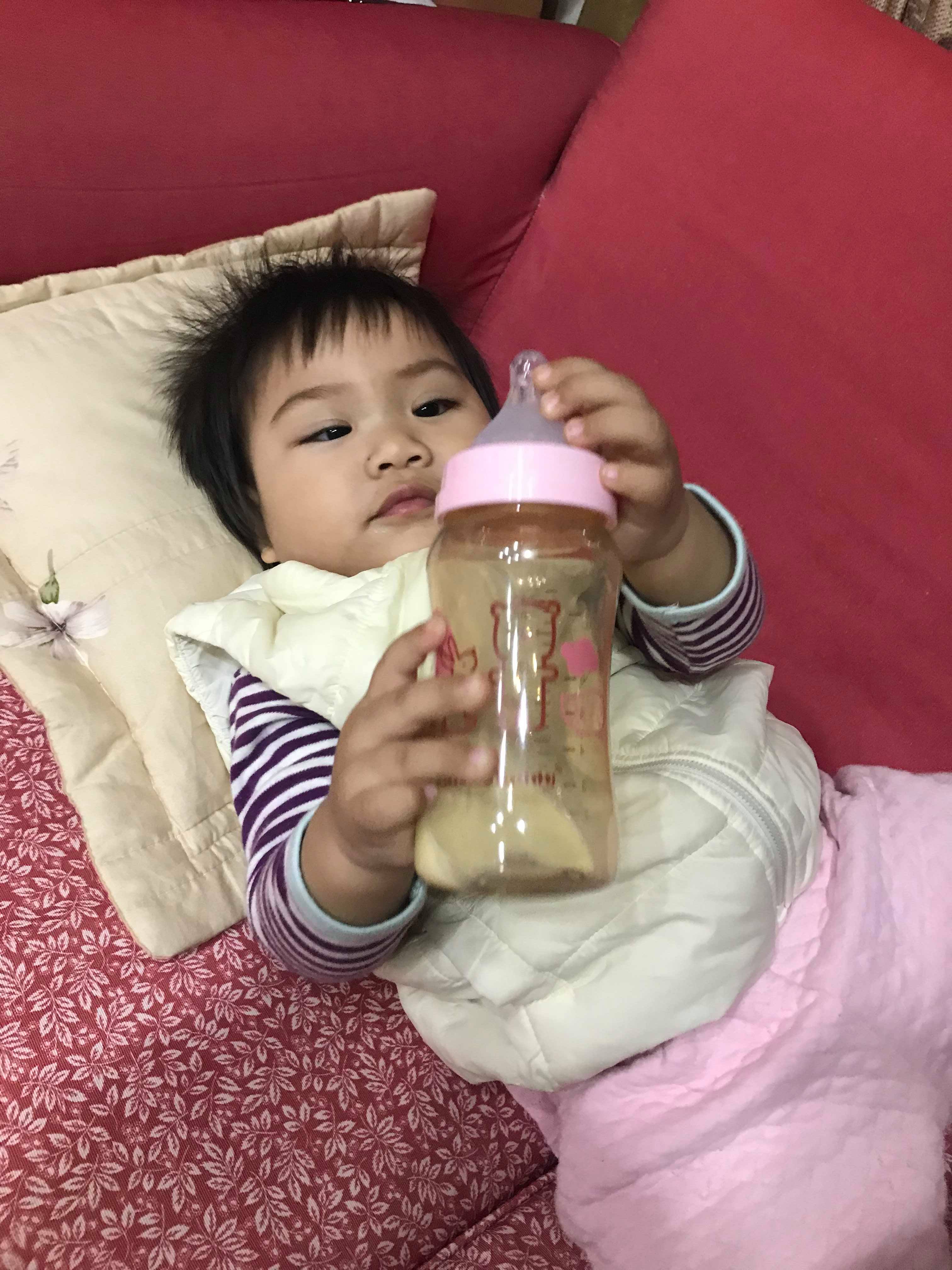 奶瓶上有熊熊的圖案,妹妹看了一直想去拿呢