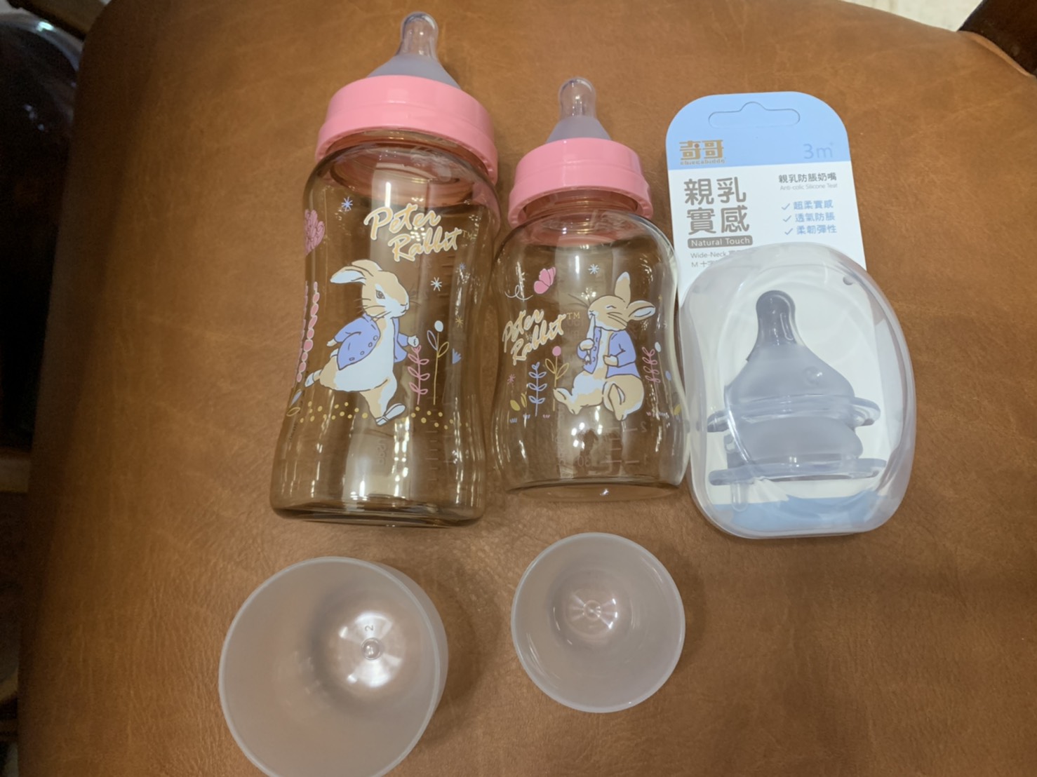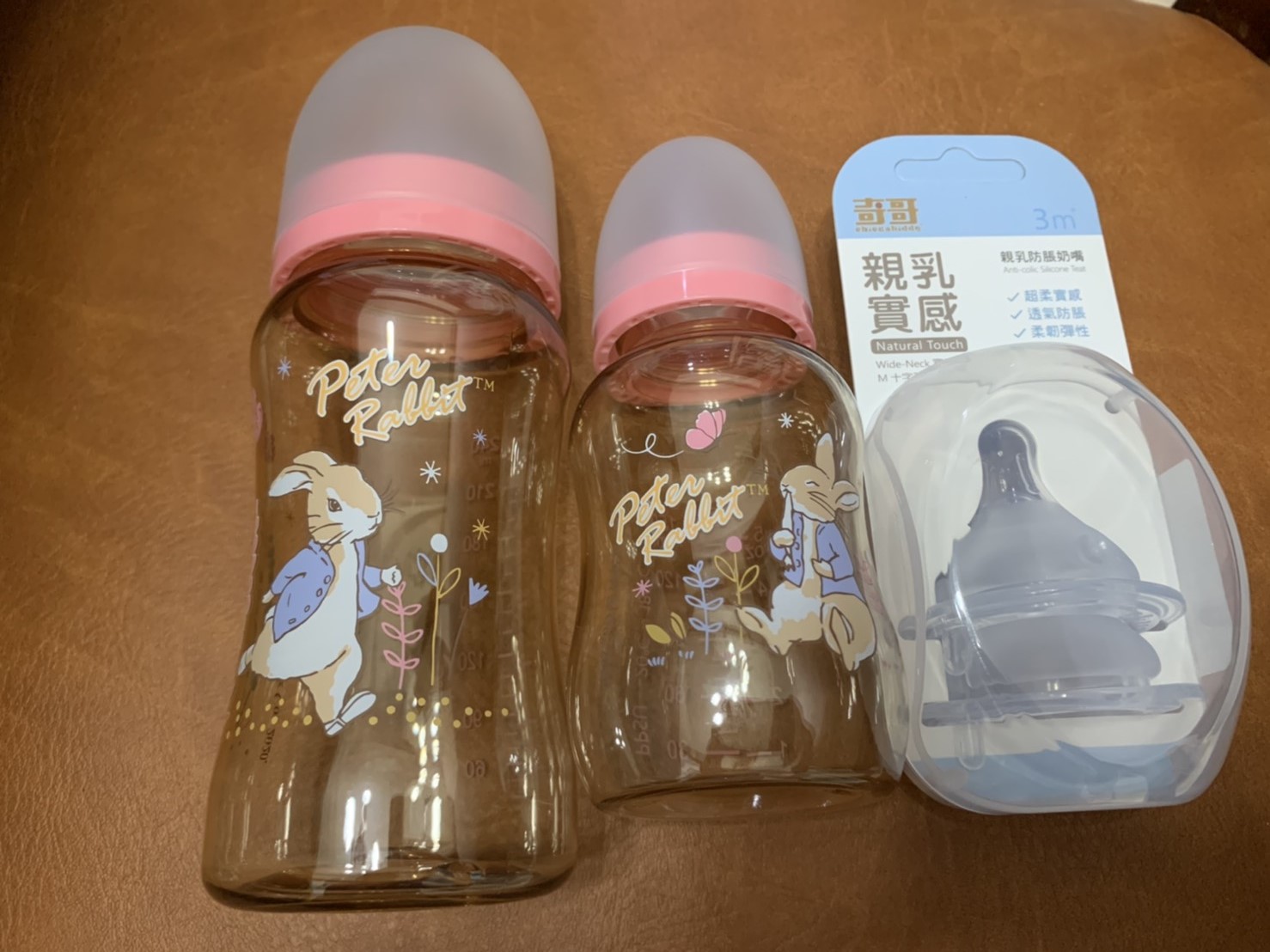 等幾天後,就收到了比得兔PPSU奶瓶-寬口徑*1、標準口徑*1以及親乳防脹奶嘴一組