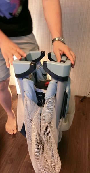 嬰兒床要帶出門不容易,但比得兔雙層遊戲床收折起來只有樂珵ㄚ爸大腿一半的高度,